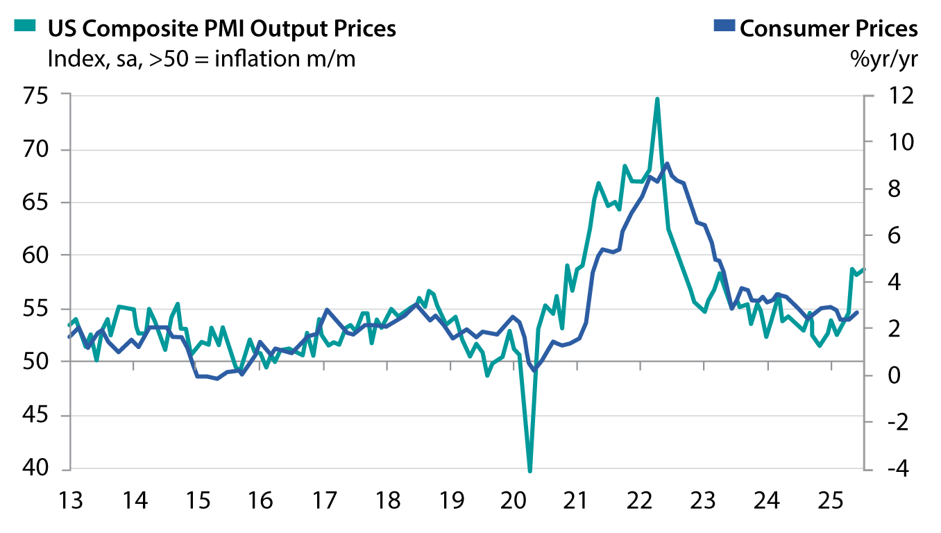A high-profile visit from President Trump to the Federal Reserve, and some ‘face time’ with Jerome Powell, the Fed’s President, all sought to put pressure on the US central banking authority to lower rates. Whilst rate cuts are not expected at the July meeting, we find it very difficult to make the case for further easing over the balance of the year either. With the liquidity taps already flowing, and the residual government spend from the Biden infrastructure programs, the US economy has not cracked, displaying remarkable resilience in employment numbers. Furthermore, increasingly visible signs that inflation has bottomed may also constrain the Fed’s hand. The below chart shows evidence of tariffs impacting consumer prices (CPI). This inflation measure is composed of different components, one of them being prices paid in business surveys, and the chart shows historically how a major pick up in output prices has tended to lead consumer prices (the blue line leading the orange one).