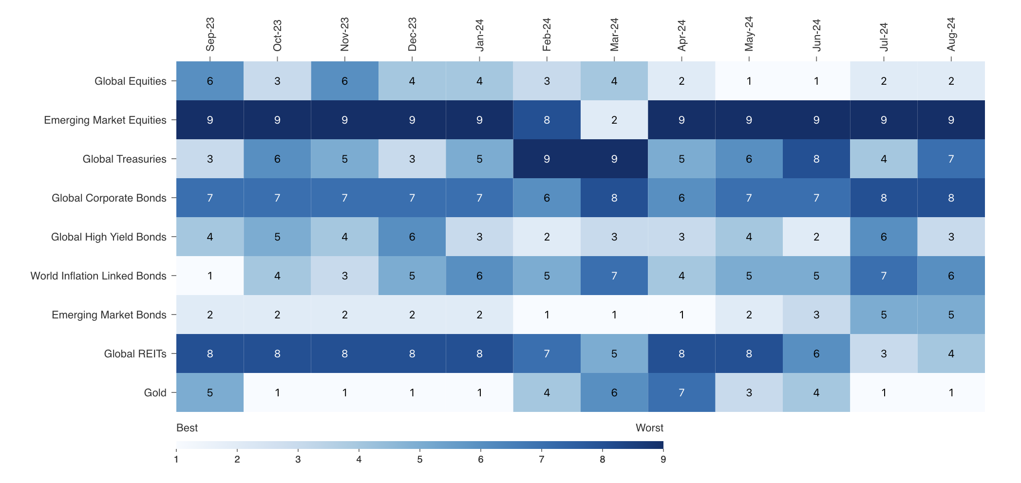 • Over the last 12-months, equities and gold had better expected return rankings than bonds
