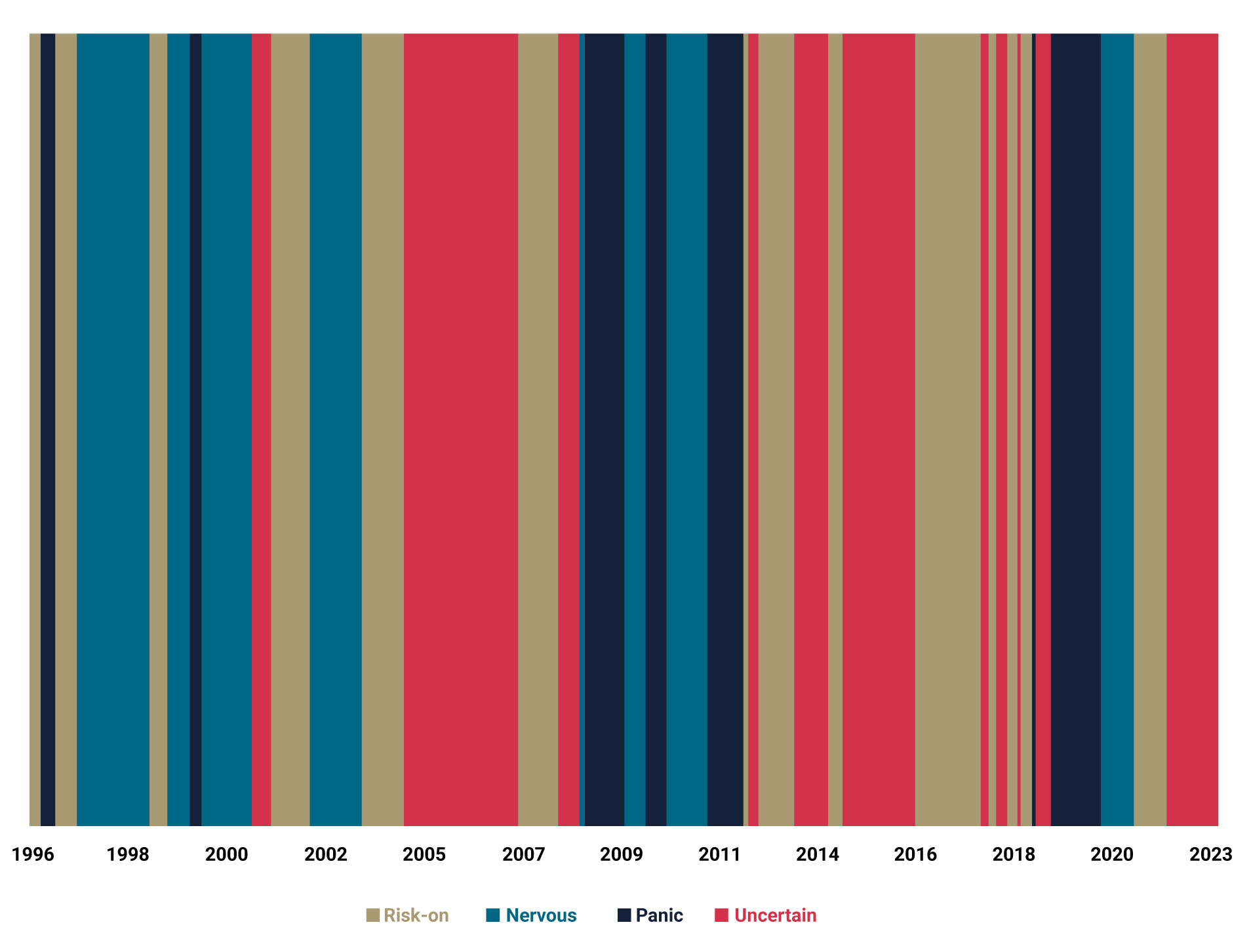 • Panic — Risk is punished, with strong returns to defensive assets and the weakest returns to risk assets.