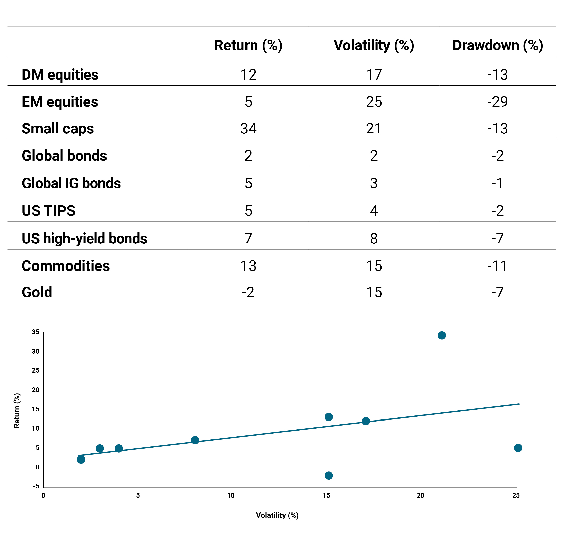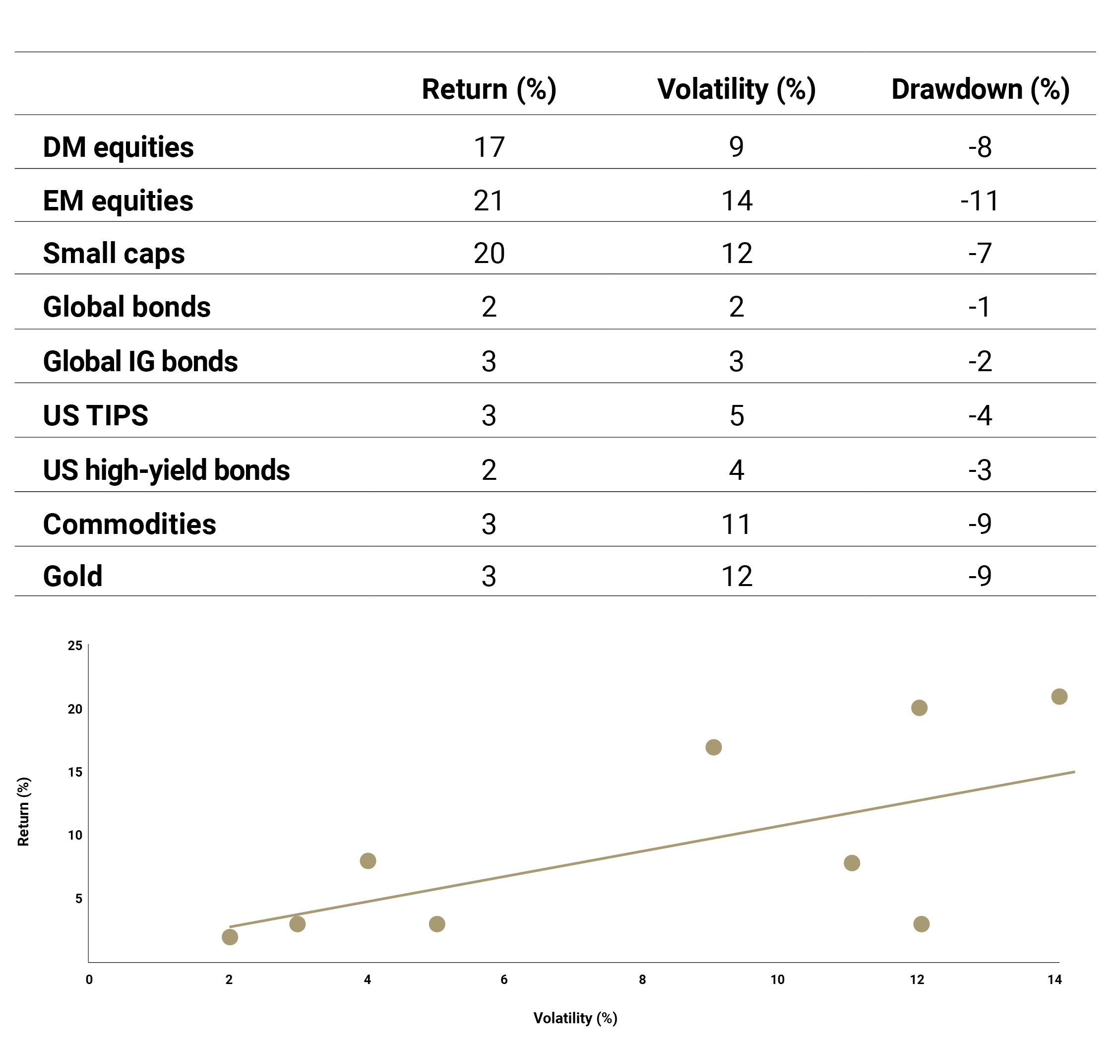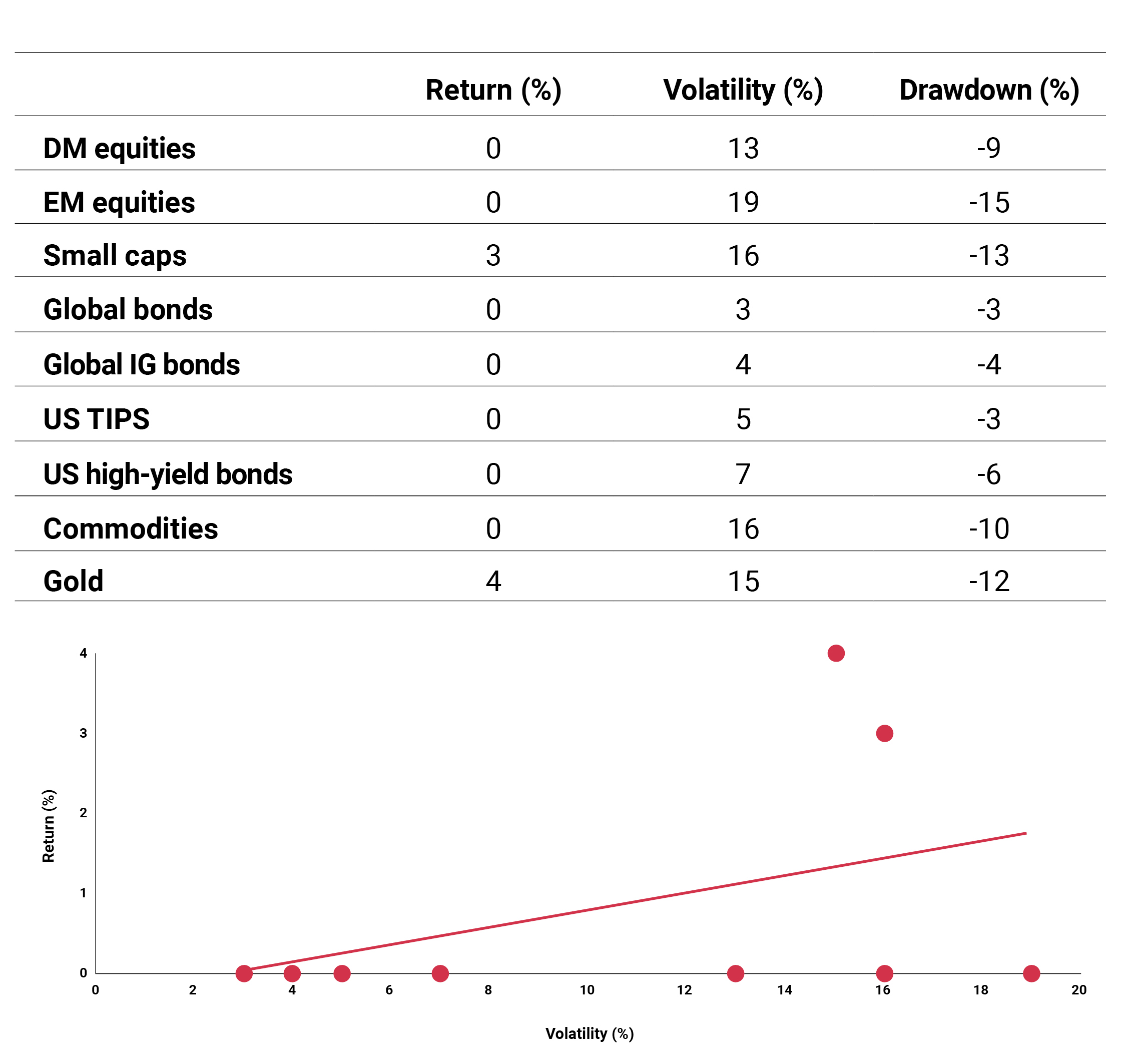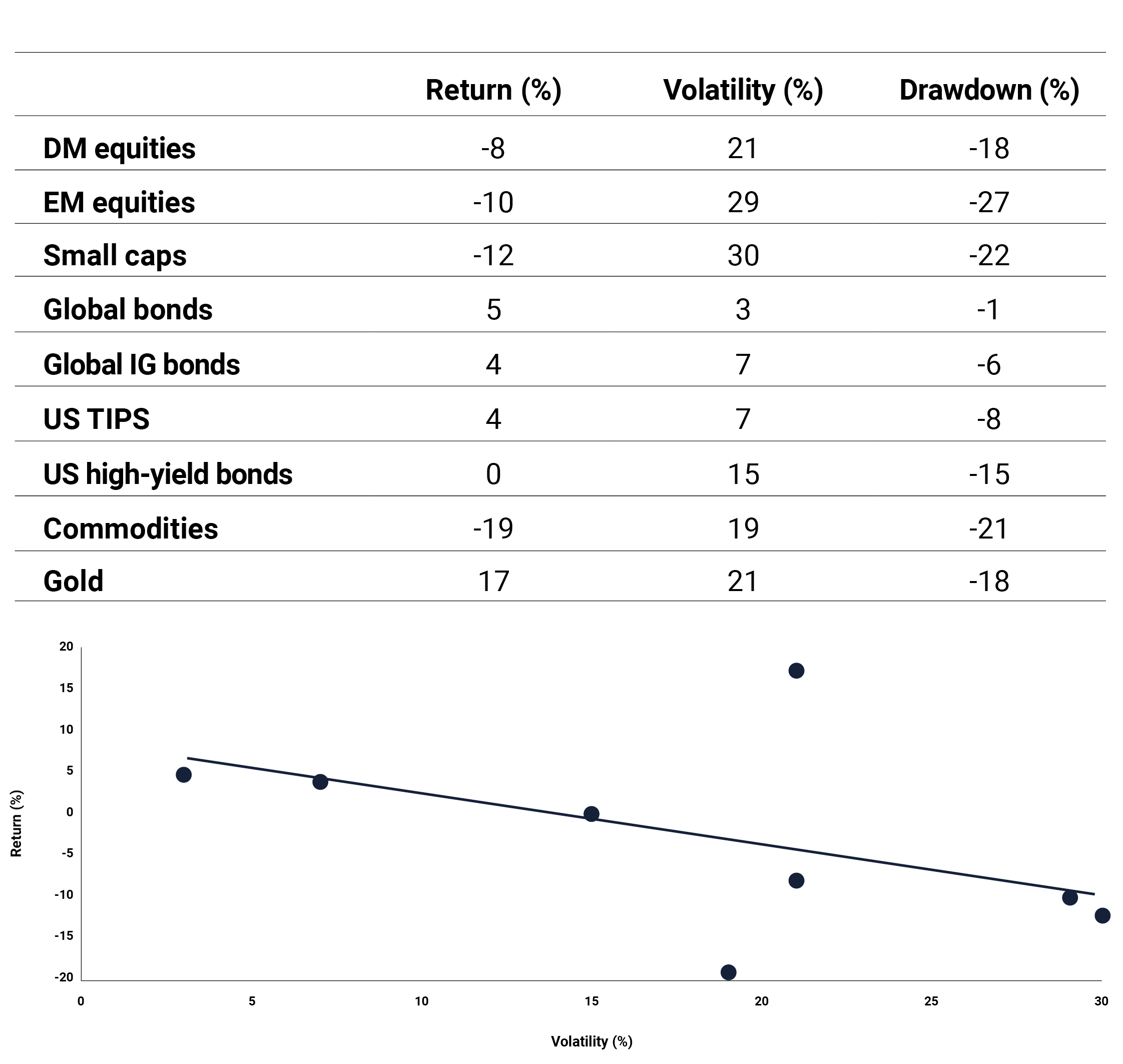 This was the rarest of the four regimes (about a sixth of the time), characterized by a negative relationship between risk and return, elevated volatility, and high drawdown risk. As shown in Figure 4, returns for risk assets (equities and commodities) were universally negative, and often by double digits. Their volatility and drawdown risk were also elevated. In contrast, defensive assets produced positive returns, with global government bonds in particular delivering their best return and lowest drawdown of all the regimes. Gold, often viewed as a safe-haven asset during times of market instability and high volatility, also achieved its best return. The downward sloping return versus volatility chart is perhaps the best illustration of this period.