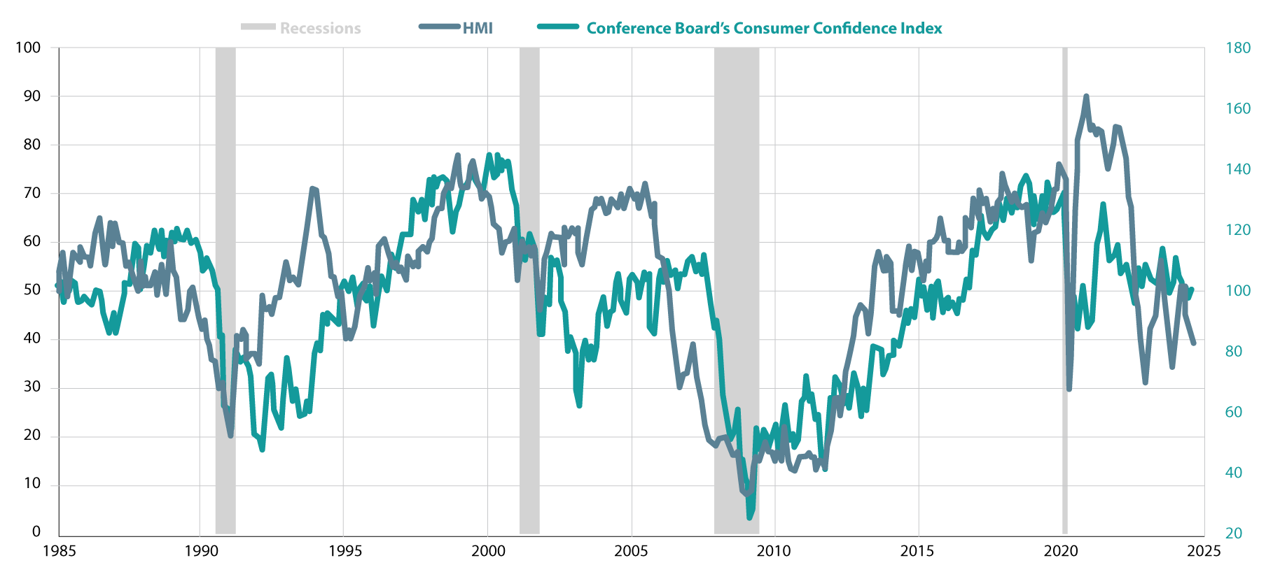 For months now, interest rates have consistently surprised on the upside, alongside the strength of the US consumer. That’s to say ‘bond bulls’ had to continually temper their expectations for interest rate cuts throughout 2024. On December 19th, Jerome Powell, Federal Reserve Chair, further took the wind from their sails in slashing interest rate cut expectations from 4 to 2 in the coming year. (Rather than interest rates falling by 2.00% the Fed is now predicting only 100 basis points of cuts). Housing by its nature, is a big-ticket item being funded largely by borrowings, hence it is interest rate sensitive. Housing numbers are a lead tell for the economy. If housing data is weakening, at a point in time when employment growth and hence wage growth is too, then de facto the consumer will likely begin to feel a little less buoyant. Having churned through pandemic bestowed stimulus savings, savings rates, already unsustainably low, will need to rise. This is all to describe a less than virtuous cycle where consumption growth will trail income growth, and the US consumer powers 70% of the economy.