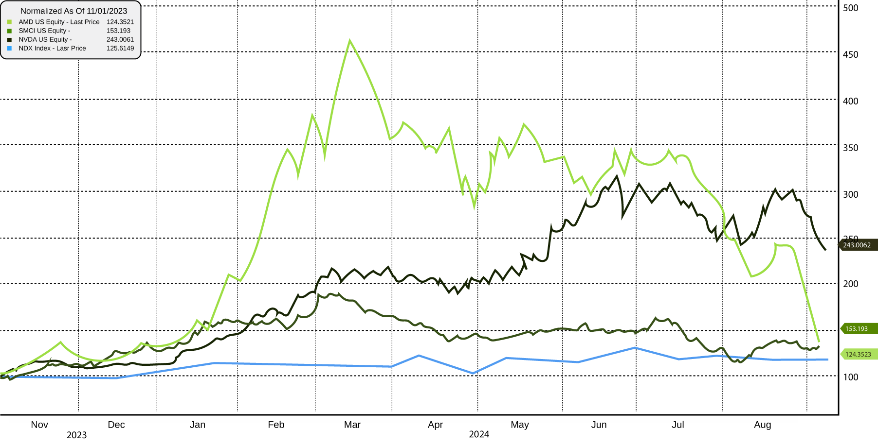 Chart showing 2024 YTD price action and AMD, SMCI, NVIDIA and ultimately the Nasdaq topping in sequence.