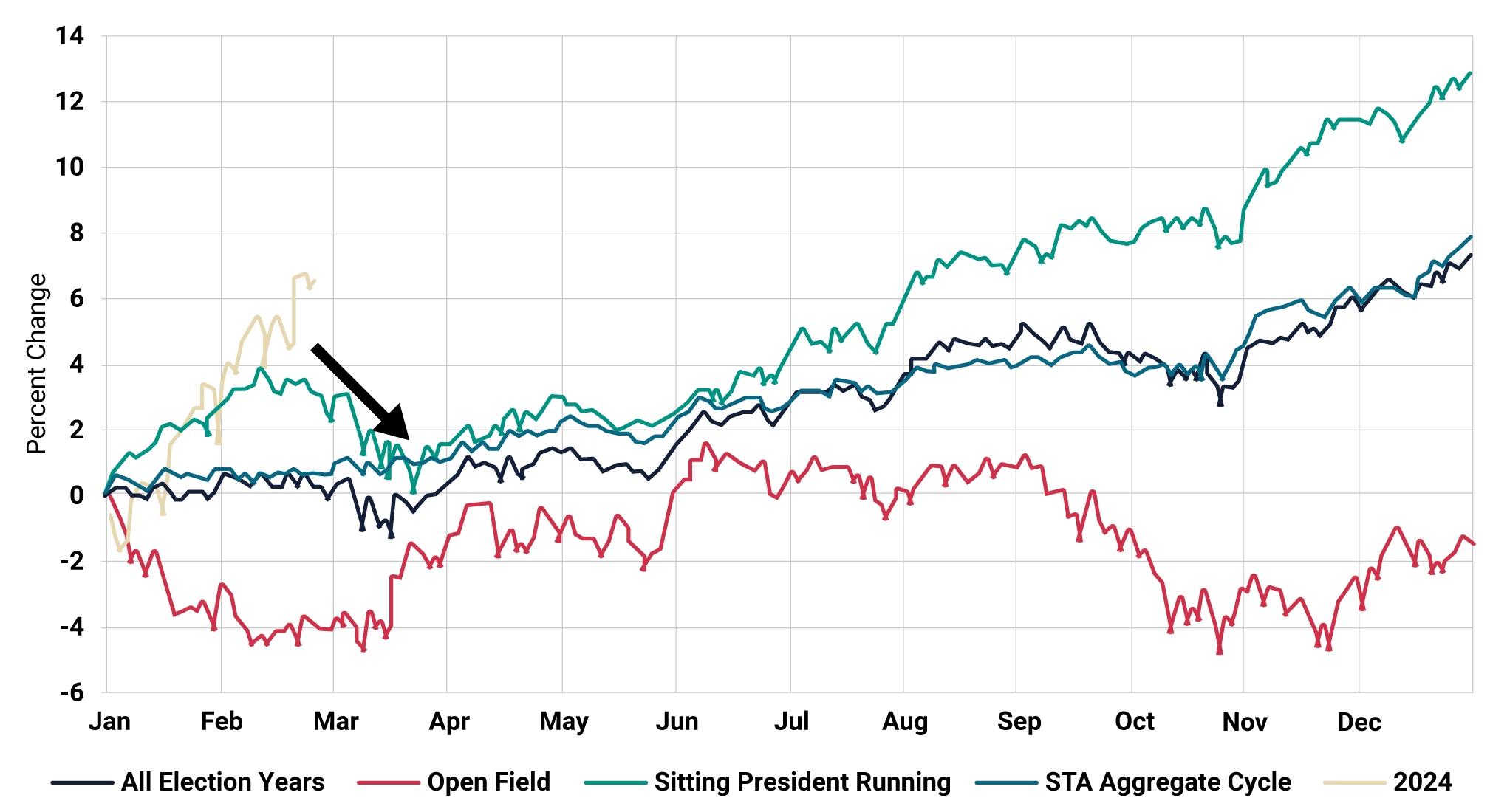 Historically, ‘Sitting President Running’ Election years are strong performers, and 2024 has been no exception. The seasonal pattern below confirms just that. However, with now a greater degree of uncertainty, it is very possible that we fall into the ‘open field’ pattern as recorded below as the Democrats look to switch their Presidential candidate.