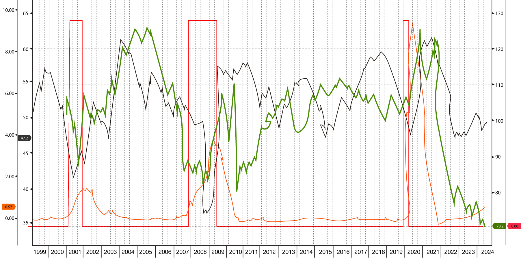 During the last three cutting cycles – show where the purple line is falling 2001, 2008 and 2020 grains, oil, metals and Gold have all responded differently. Of course, each cycle has had different rationales for lower rates. Most obviously gold seems to respond to lower interest rates most positively, yet oil and metals, tied to the economic cycle are less likely to benefit, as having fallen in each period of lower interest rates.