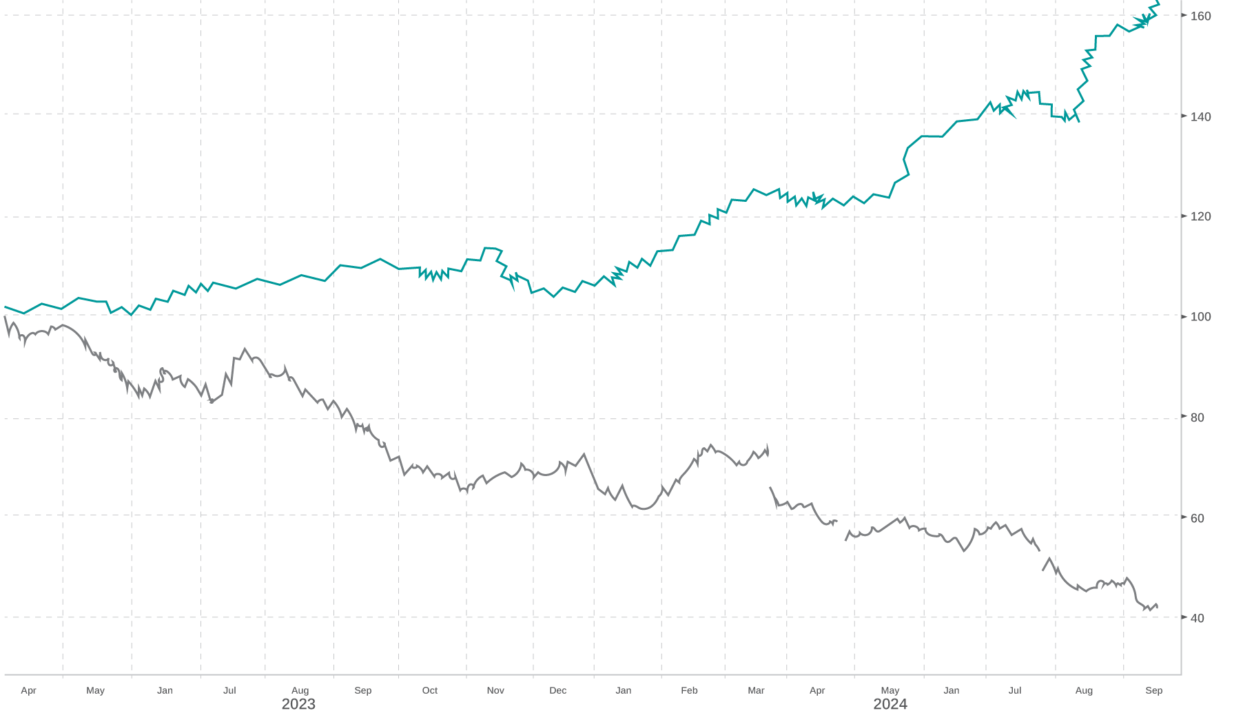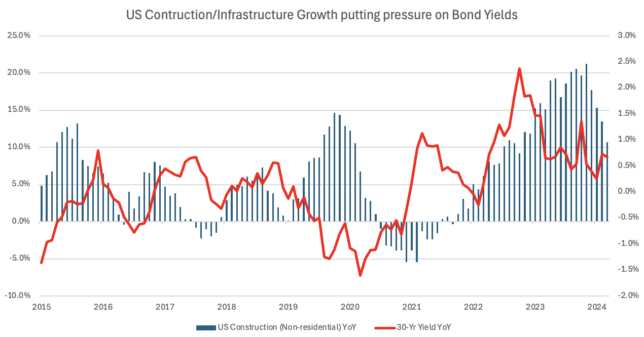 Biden's tenure has been characterised with three major pieces of legislation, including the Inflation Reduction Act, that has generated massive infrastructure spend. Such large government fiscal stimulus tends to lead higher interest rates, although the pace has begun to slow more recently, perhaps removing one tailwind for the 'higher for longer' narrative.