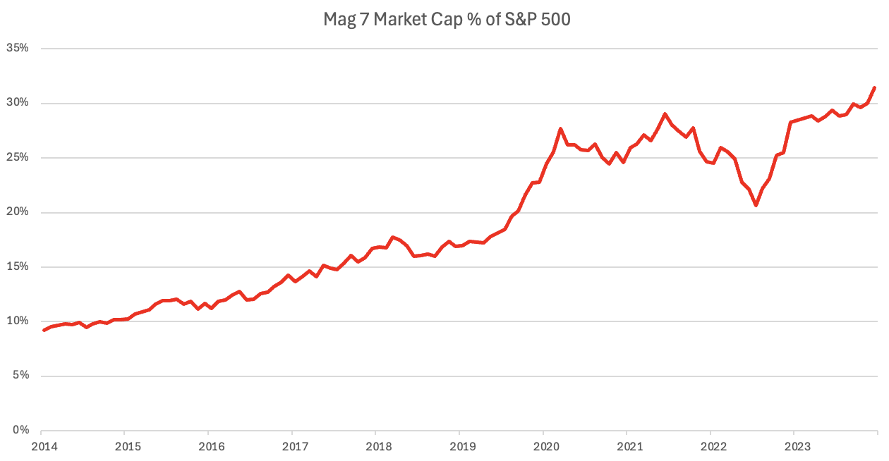 US large cap tech, notably Nvidia in recent times, have often accounted for much of the wide US market's performance. However, rarely have they accounted for our 30% of the market's capitalisation.
