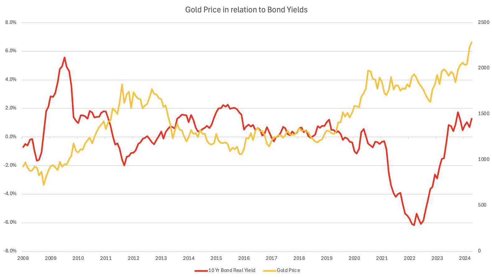 Usually rising interest rates would at least cap Gold's price appreciation. In fact, often the two demonstrate an inverse relationship. However, in the recent past, even whilst bond yields have moved higher, Gold has appreciated nonetheless - in part no doubt driven by geo-political tensions perhaps.