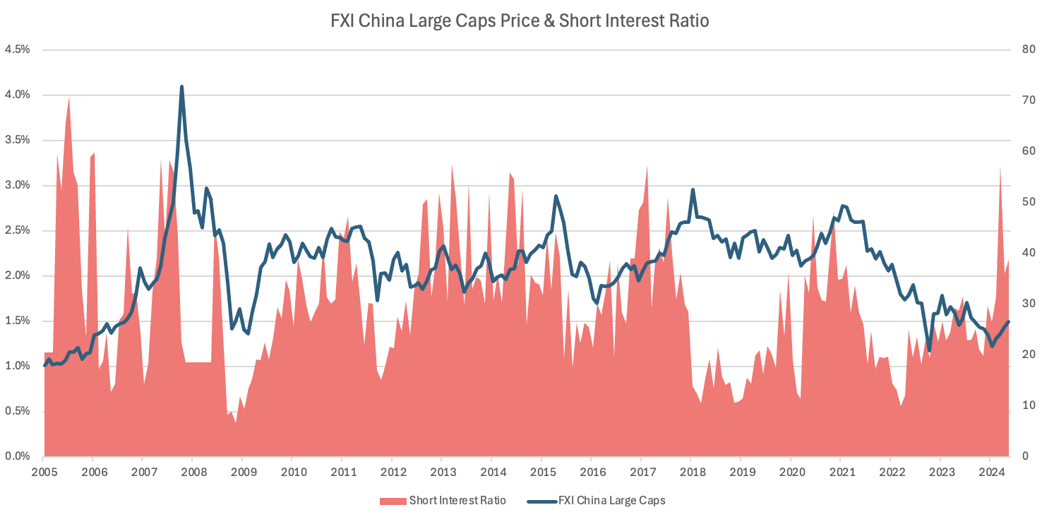 There are more than a few reasons to suspect the Chinese stock market has seen an intermediate, and probably long term bottom. Not least the historic spike in short positions in the Chinese FXI ETF, suggests selling had reached an extreme.