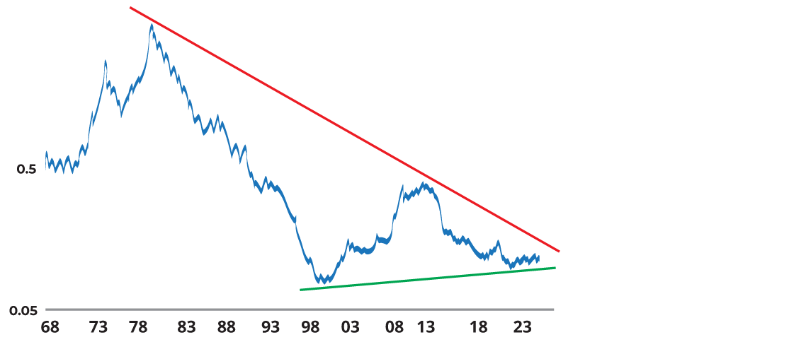 Despite the epic bull run in gold, it’s “only” just kept pace with US equities at the time of writing - circa 26% YTD. Moreover, the below suggests there is still a long way to run. The most likely reason for this chart to turn up (if it does), would be for equities to enter a correction/bear market, and gold to either hold its ground or continue to move higher. These triangle patterns can be very reliable and the longer the time frame, (30 years), the more powerful the signal would be