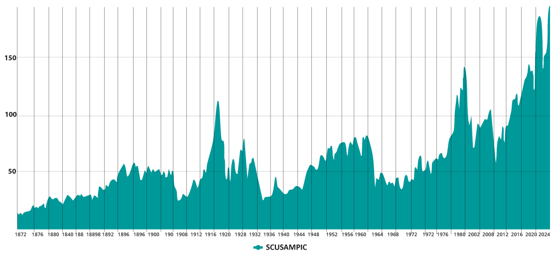 *Data from 1845 to 2015 is from the Bank of England. For 2016 to 2024 the share price series has been extended using price returns of The FTSE All Share Index. House price index has been extended using annual returns from the Land Registry: 2024 house prices are as of October 2024