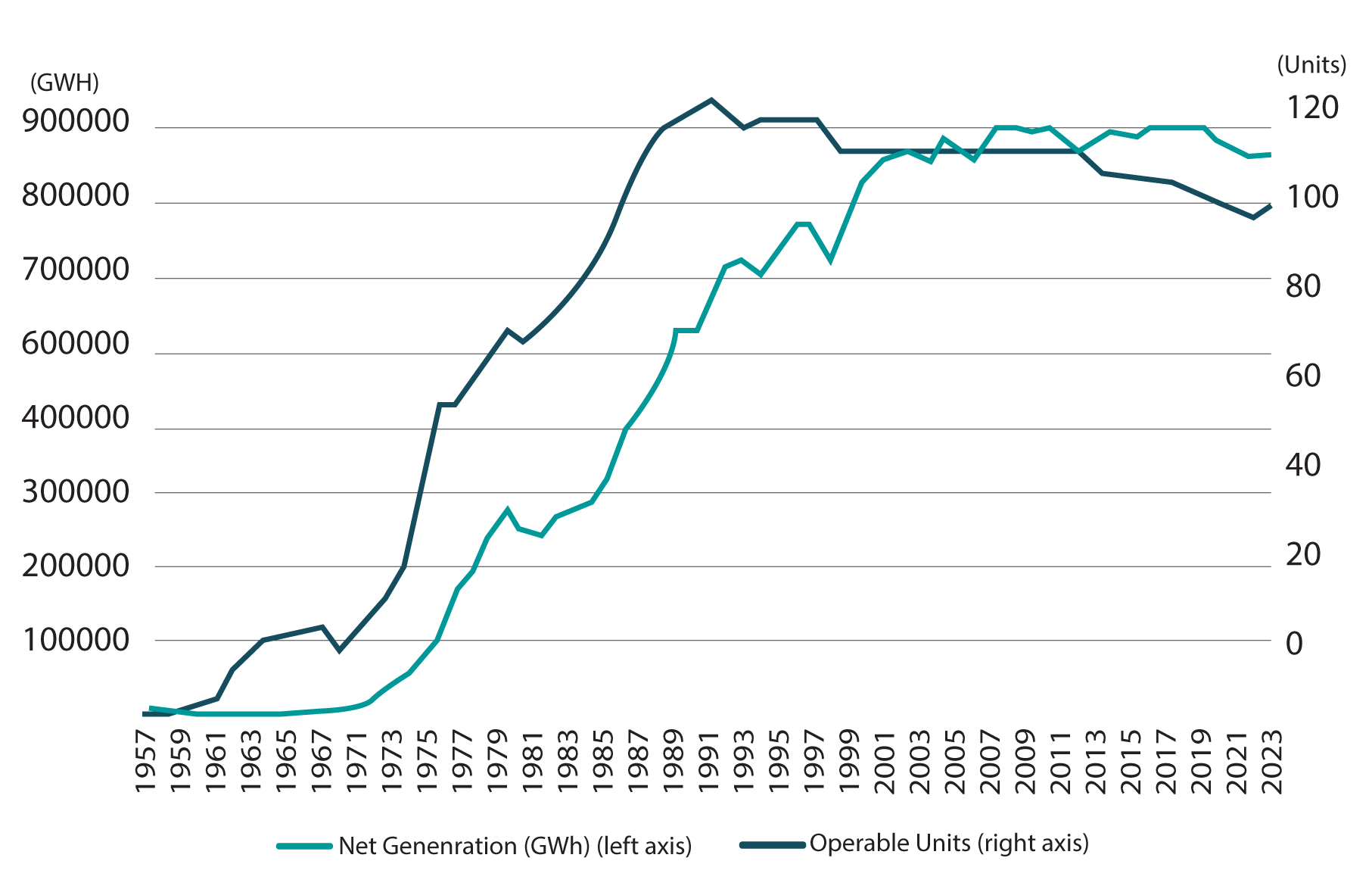 The nuclear power industry in the United States has been stagnant for over thirty years. The number of operable units peaked in 1987 and net generation has been flat since the late 1990s. The average operating U.S. nuclear power plant is 42 years old.