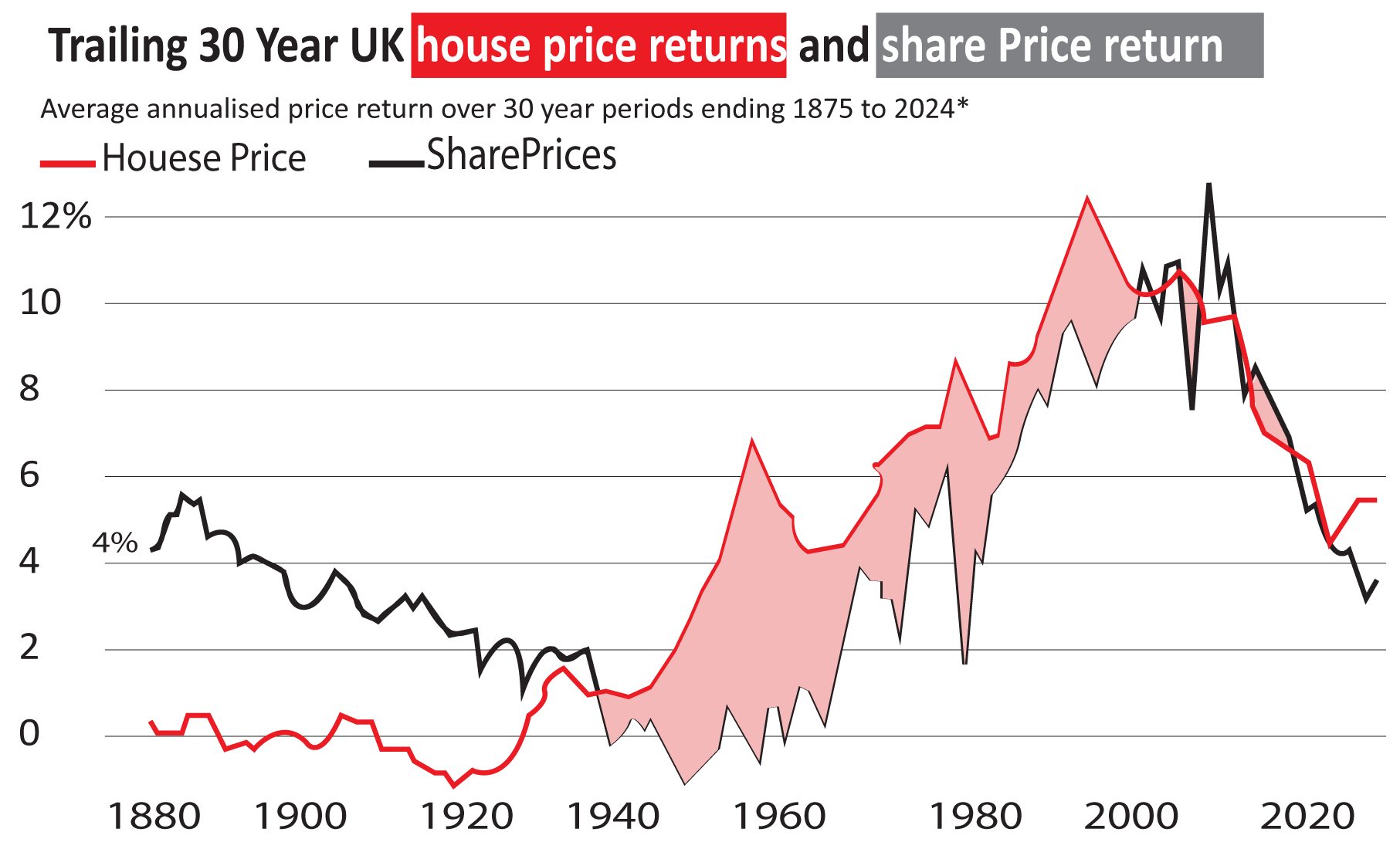 We can see how neither house prices nor share prices always go up, even over long time periods (although most of the time they do, and since 1945 they consistently have done, although this doesn’t account for inflation). In that respect the performance of both assets have tracked higher, with trailing 30-year returns rising steadily during the post war period.