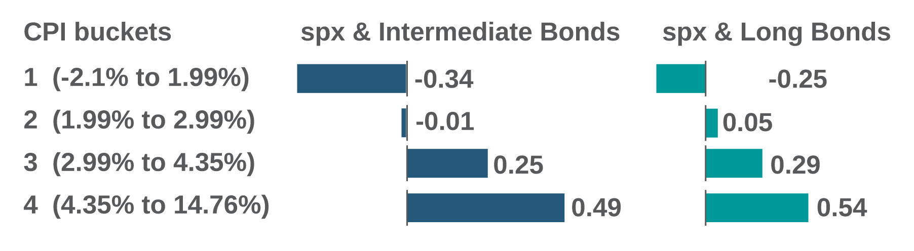 The correlation of stocks and bonds depending on the level of inflation (as measured by the Consumer Price Index – CPI)