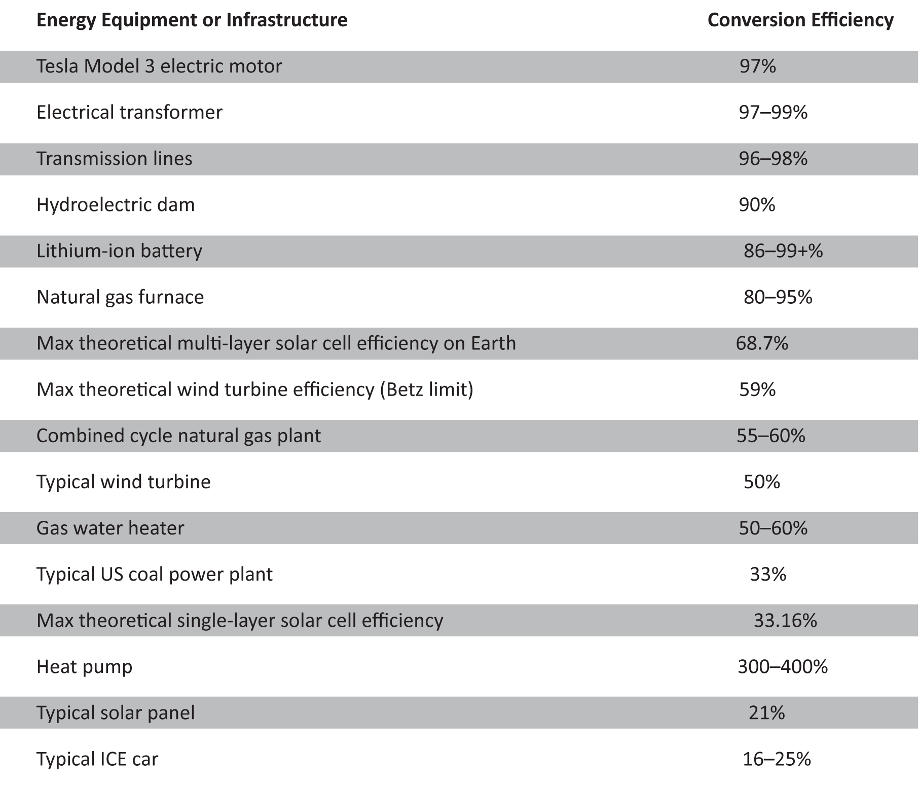 Conversion or transmission efficiencies of various pieces of energy infrastructure.