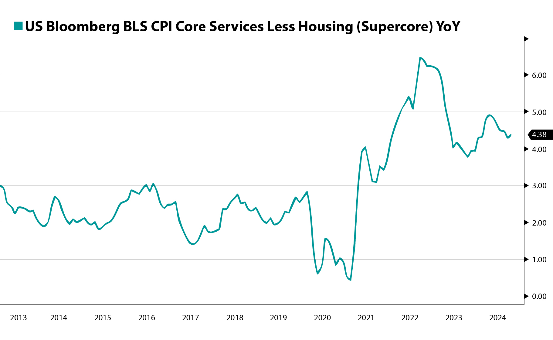 So ever since September 2022, when inflation peaked, we’ve seen a disinflationary pulse falling from 6.6%. However, that dynamic has now stalled, whilst ‘supercore inflation’, which is a focussed on core services excluding housing, remains stubbornly high. Chairman Powell considers Supercore as the most important measure for understanding inflationary pressures, both as a current read and as an indicator of future trends. In short, when excluding some of the falls attributable to housing, supercore inflation is still running at 4.38% as below.