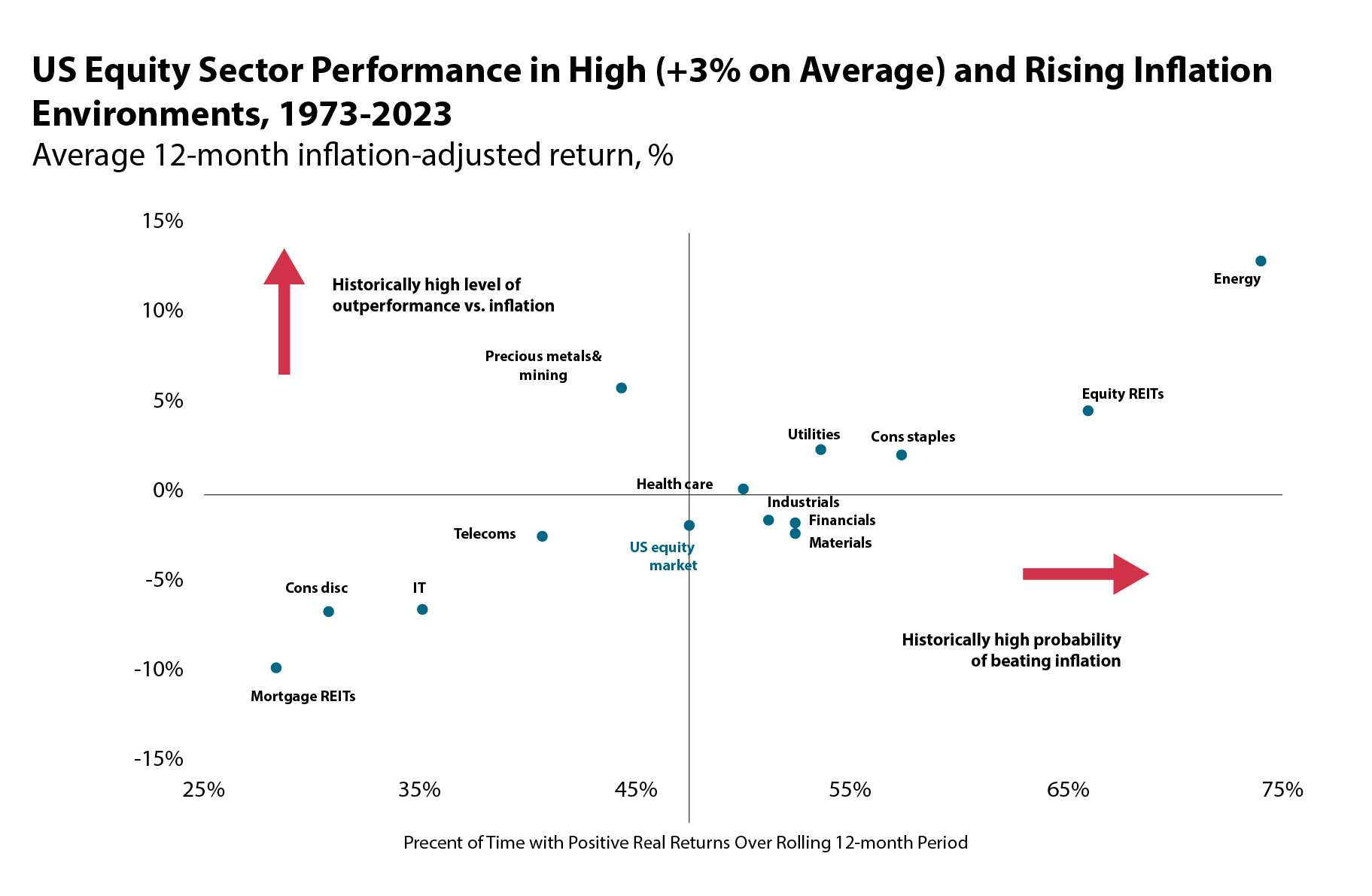 Figure 8: Equity sector performance in elevated inflationary regimes (3%+ average) from 1973 to 2023.