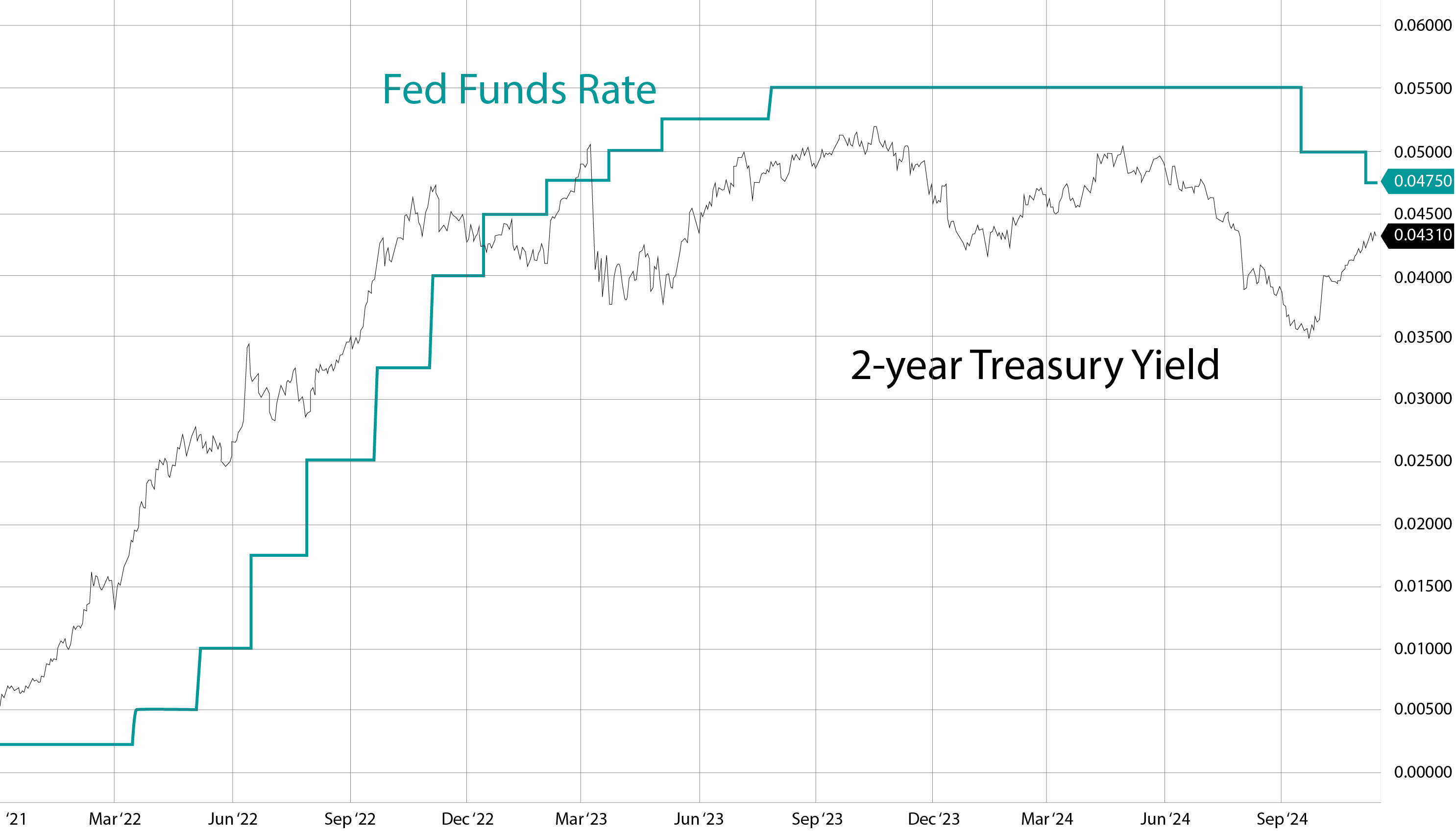 The chart above displays the Fed Funds Rate (blue line) compared to the 2-year Treasury Yield (black line). Historically, 2- year government bond yields often have a track record of leading changes in Federal Reserve interest rate policy. Since rising sharply at the end of September, the 2-year Treasury yield is now just 0.45% below the actual policy rate, suggesting the market anticipates fewer than two additional interest rate cuts.